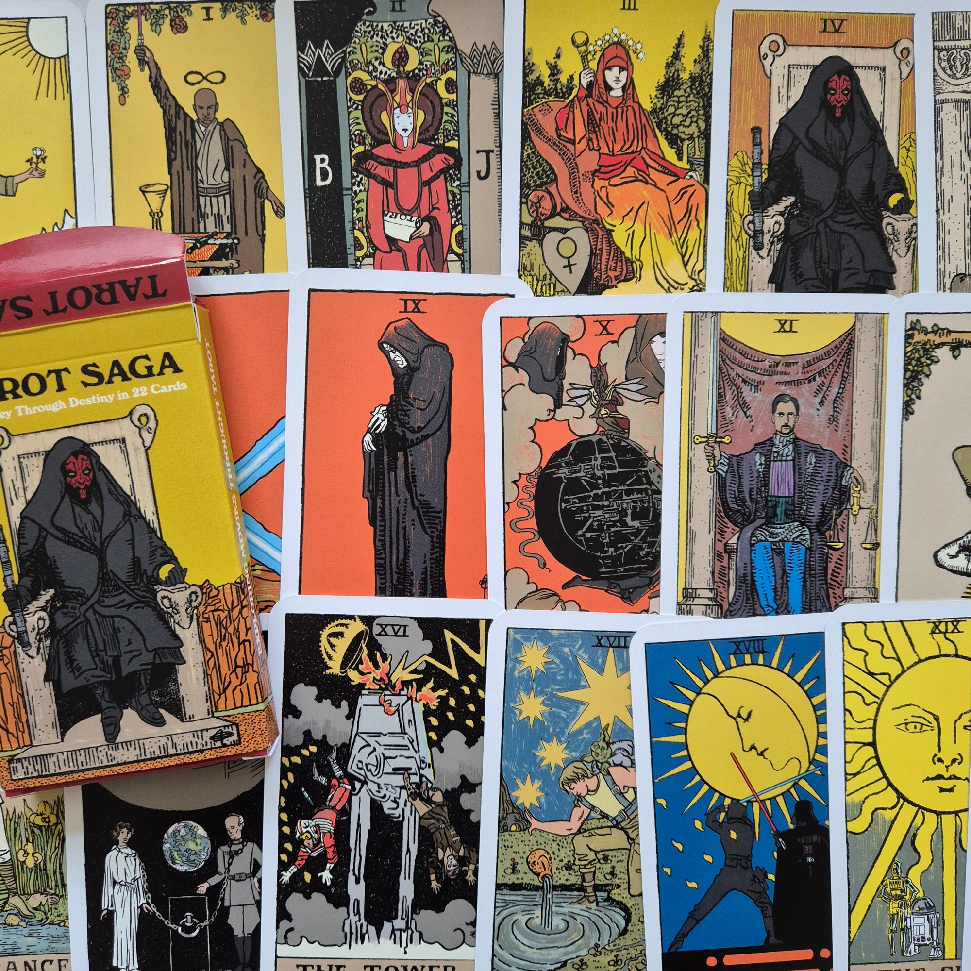 The Tarot Saga, a brand-new 22-card major arcana deck. This unique deck re-imagines the 22 Major Arcana Tarot through the lens of Pamela Colman Smith's Tarot illustrations, and the 6 Star Wars movies, episodes I-IX.